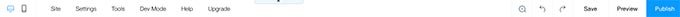 En la parte superior de la página, tendrás el menú principal. Lo usarás para navegar tu sitio, moverte entre la vista de escritorio y móvil, acceder a tus herramientas, configuraciones y modo de desarrollador, previsualizar y publicar cualquier cambio realizado en el sitio.