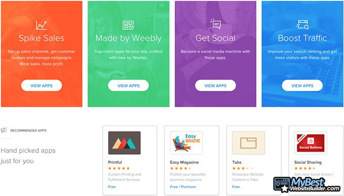 Una vez que hayas personalizado tu tema, es hora de añadir aplicaciones a tu sitio web. Como probablemente te habras imaginado, debes hacer clic en "Apps" situado en la barra de navegación, este te enviará al Weebly App Center. La empresa te ofrece más de 300 aplicaciones para elegir. Algo realmente impresionante.