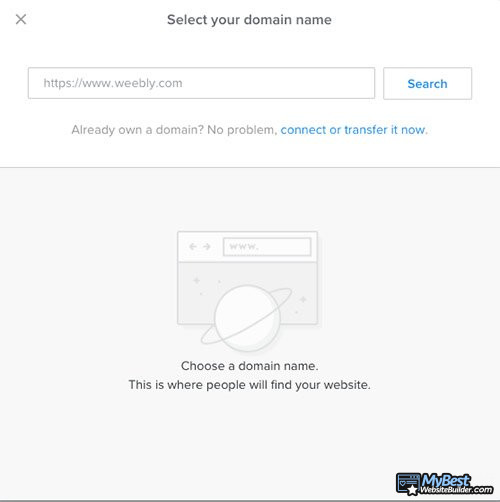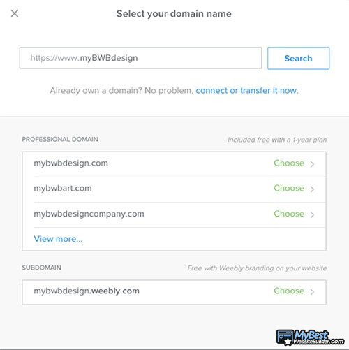 Ahora bien, si ya tienes un nombre de dominio, puedes elegir entre conectarte o transferirlo inmediatamente. Sin embargo, si no, puede elegir de la lista de los nombres de dominio disponibles que Weebly ofrece.