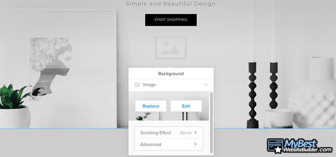 Para personalizar un sitio web, puedes empezar con el fondo. Todo lo que tienes que hacer es hacer clic en el fondo y hacer cambios; añadir o editar una imagen, elegir un efecto de desplazamiento y funciones más avanzadas que te permitirán guardar los cambios en más páginas, así como alinear el contenido a tu gusto.