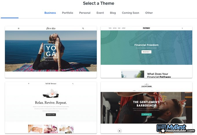 - Negocios; plantillas para restaurantes, barberías, estudios de yoga, servicios financieros, innovaciones, etc.