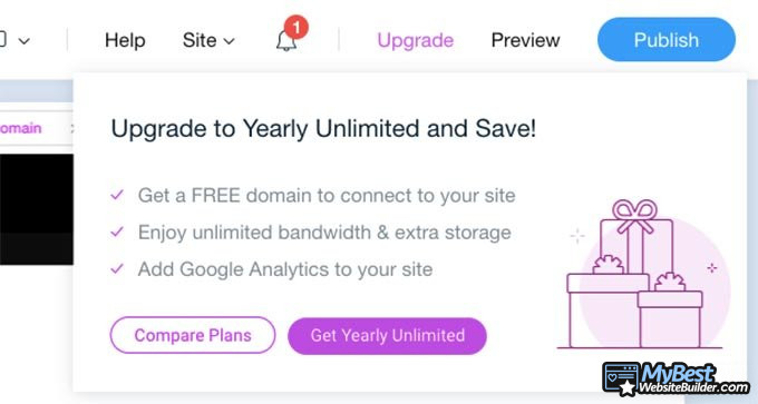 En tu tablero, simplemente desplázate hasta el botón "Actualizar" en la esquina superior derecha de la pantalla, y tendrás la opción de ver los planes de precios de Wix, compararlos y contrastarlos.
